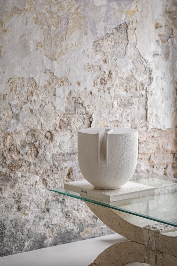 With Clausa Forma, artist Guy Buseyne aims to invoke feelings of curiosity. Its contours resemble that of a vase, yet this contemporary design piece is solid, pierced only by a narrow opening. When looking upon it, one senses the desire to know what’s inside. This clean-cut, contemporary design object is made from ceramic and is handmade in an artisanal ceramic studio in Portugal. The irregular stone-like surface and natural, neutral tone provide a calm feel, fit for any contemporary interior.