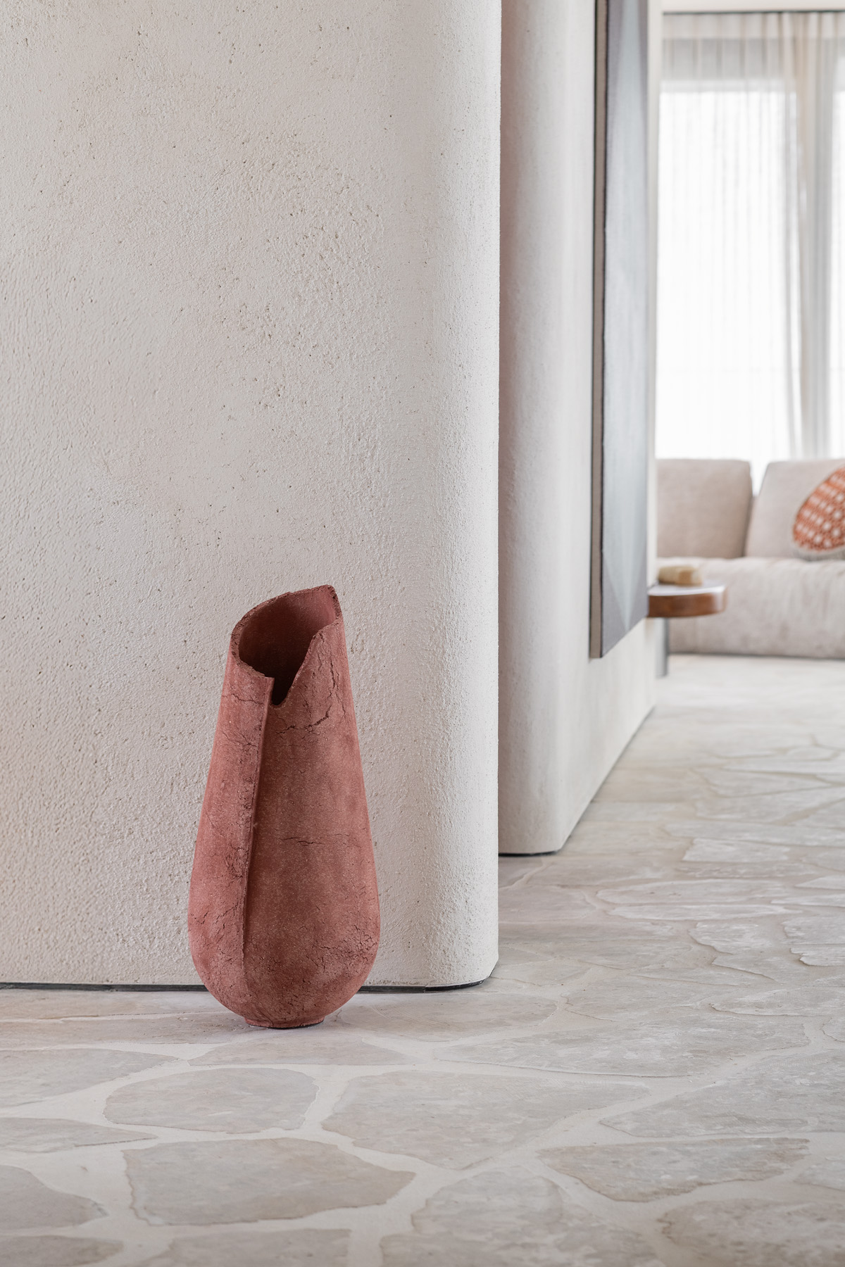 Desert Vase is a hand sculpted ceramic vase designed by Belgian artist Guy Buseyne. Raw edges, a rough texture, flowing contour and a deep earthy red shade take the beholder on an other-worldly journey into the desert.